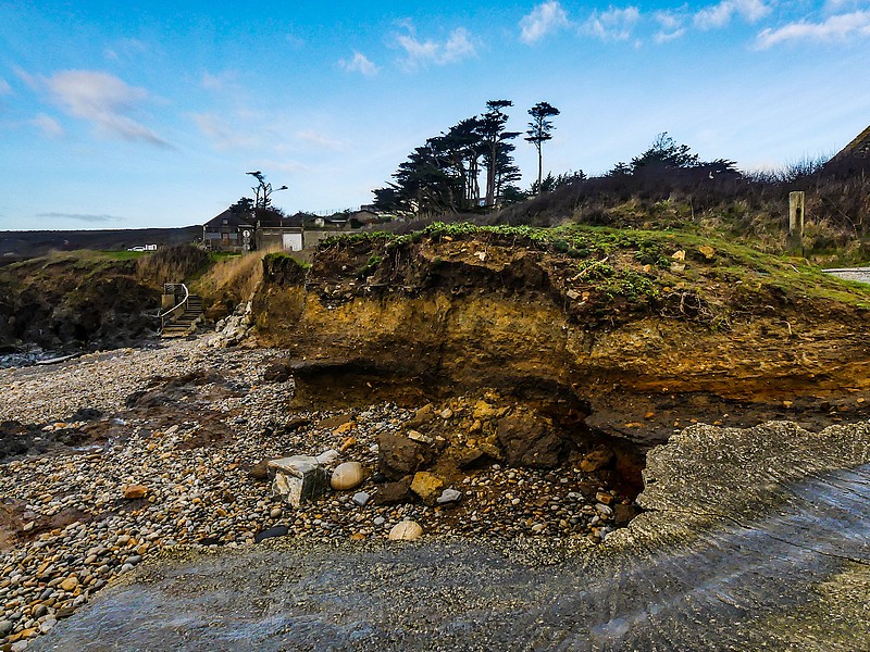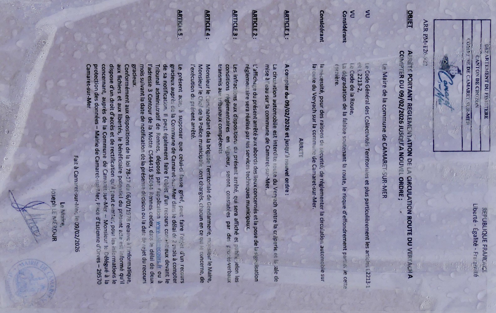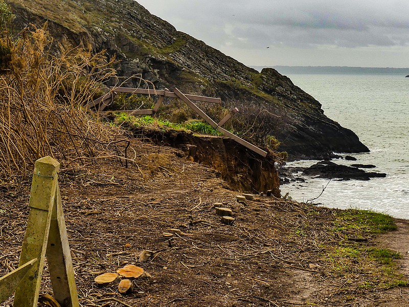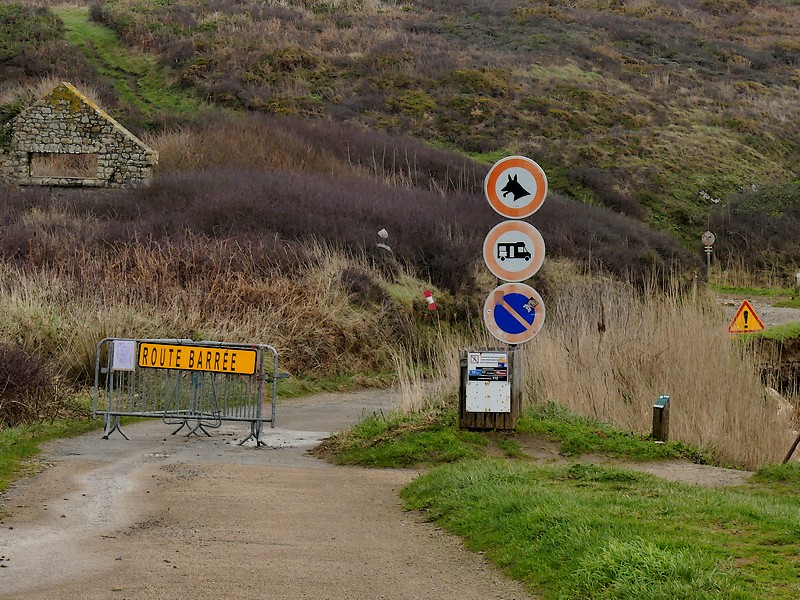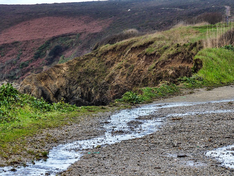 Une petite route côtière vers la cale du Veryac'h est grignotée par la mer qui passe progressivement sous la chaussée, elle-même déstabilisée par la pluie. La dégradation de janvier 2026 réduit l'accès à la plage. Dans le cas d'espèce, il s'agit d'une couche argileuse de la période post-glaciaire qui recouvre une roche au niveau de la plage. Cette terre ocre devient pâteuse puis liquide par trop d'eau douce ou salée. La route va nécessairement disparaître. Obligation prochaine de faire un détour pour le GR34.