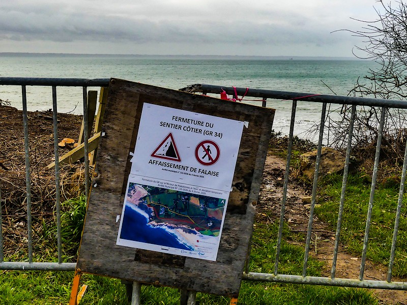 Le sentier côtier GR34 est en constante érosion avec des éboulements la plupart du temps discrets qui n'altèrent que peu le tracé des randonneurs. Cependant, comme en janvier 2026, suite à une période de pluies diluviennes, le chemin tant apprécié des touristes a littéralement perdu des tronçons tombés à la mer. L'écroulement le plus significatif est celui de Postolonnec dont l'aspect spectaculaire est passé à la télévision afin d'imager le recul du trait de côte et la conséquence sur le tourisme. En effet les déviations éloignent les visiteurs des paysages maritimes, ceux-ci se trouvent en rase campagne dans l'herbe des prés que l'on trouve dans n'importe quelle région de la campagne française. Les autorités, outre le risque d'accident permanent, s'inquiètent de cet éloignement contraint. Un effondrement de falaise, se produit n'importe quand et les signes avant-coureurs sont souvent la fissuration du sol sur les lieux de passage.