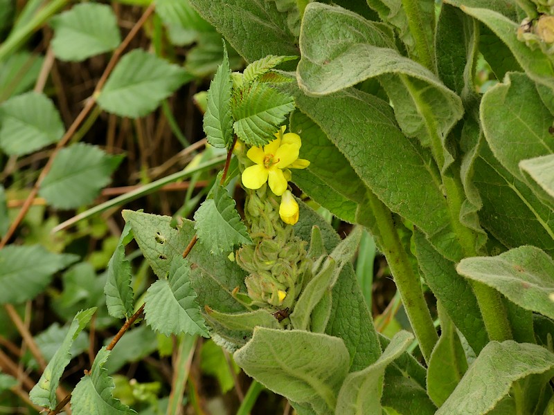 La Molène (commune) Bouillon-blanc, herbe de Saint-Fiacre – Verbascum thapsus L. Une plante bisannuelle (durée de vie deux ans) aux feuilles velues de 50 centimètres de diamètre. Première année, développement de la plante ; deuxième année production d'une tige haute jusqu'à 1.5 m portant des fleurs jaunes vivant une journée d'ordinaire. Production de graines par plant : 240 000. Plante médicinale connue depuis l'antiquité. Fréquente en presqu'île de Crozon en terrain "difficile" et ensoleillé. Nombreuses variétés à travers le monde.