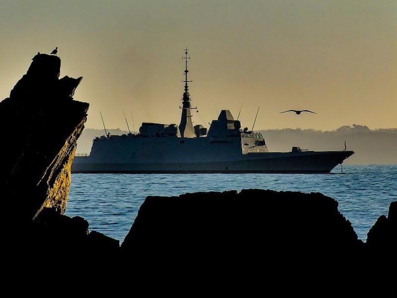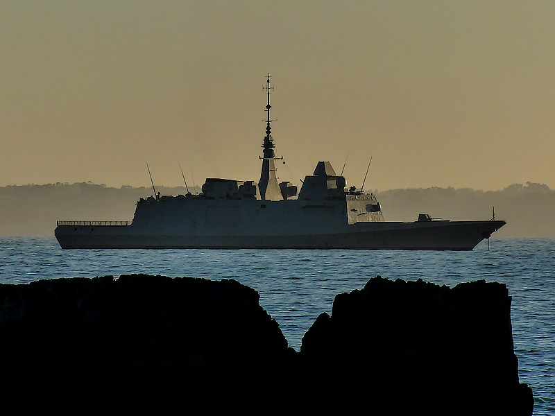 Le 13 décembre 2025, une FREMM est au mouillage dans l'anse de Morgat. L'effacement des moyens d'identification rend difficile sa désignation et c'est le but recherché par la Marine depuis 2022. Un léger panache de fumée sort de la cheminée.