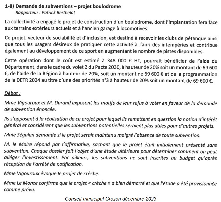 Tous comptes faits, on parle d'une dépense de 420 000€ (120 000€ au titre du département - financement commune 252 000€ - quid du restant ?) pour les uns et de 480 000€ pour les autres (côté opposition). Durant la mandature de cet élu ayant quitté le sport tant choyé aussitôt élu, celui-ci ne fit aucun logement social durant ses 6 années électives, le projet de crèche (20 ans d'âge) est toujours dans les cartons. Il est plus facile de trouver des subventions pour des projets de confort que pour des nécessités impérieuses y compris pendant les disettes budgétaires de l'Etat qui réclament des économies drastiques.