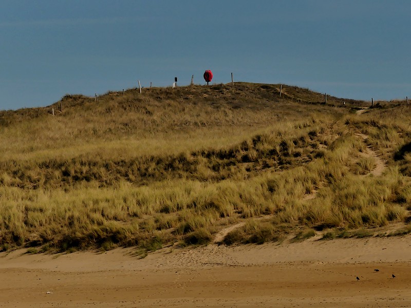 Dune blanche recouverte d'Oyat. Sur la droite, sur le sable des craves (oiseaux).