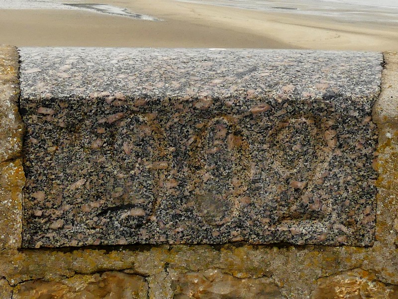 Feldspath rose, mica noir, quartz blanc. Môle du port de Morgat portant la date de construction de celui-ci. Le choix de la pierre provient sans-doute de la volonté que la date (1902) ne s'efface jamais.
