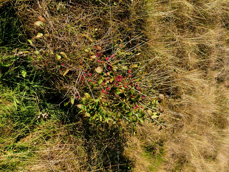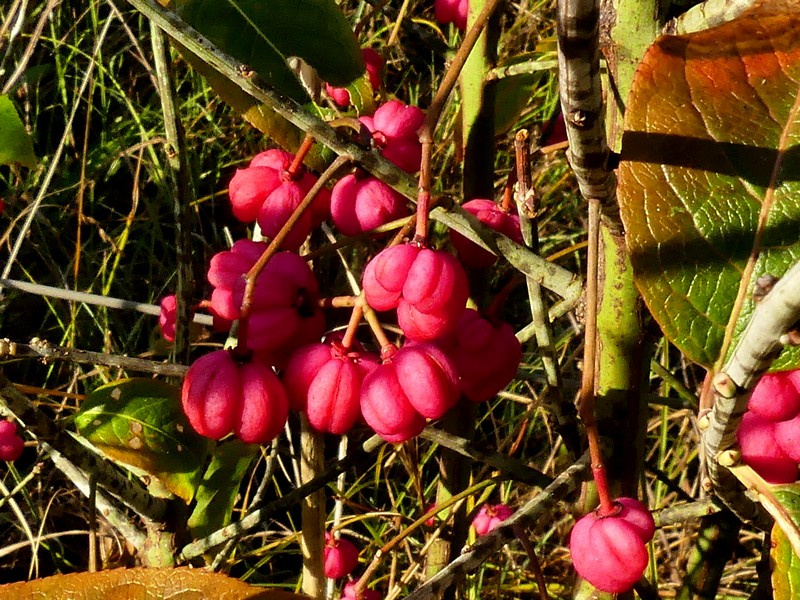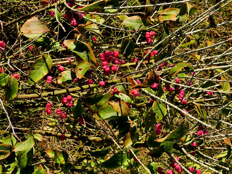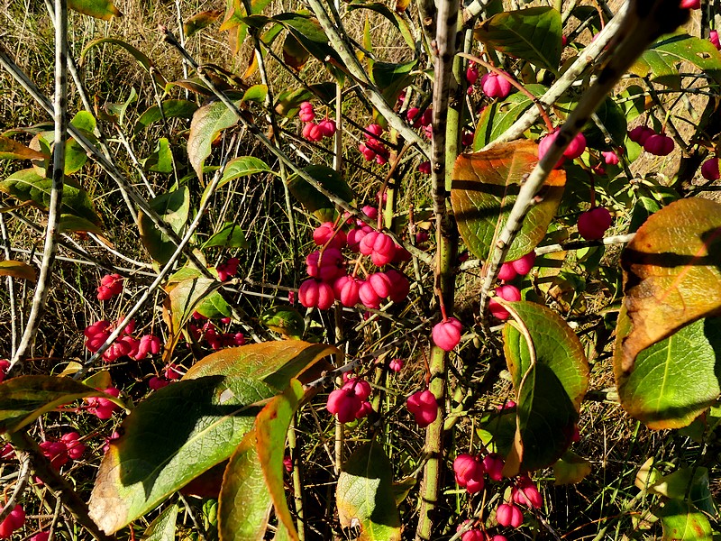Fusain d'Europe – Euonymus europaeus L. – un spécimen échappé d'un jardin probablement se trouvant en cours de développement au bord du sentier de grande randonnée (GR 34) dans les dunes maritimes de la plage de la Palue (Crozon). Parure automnale avec ses capsules (arilles) roses toxiques qui s'ouvriront ultérieurement pour libérer des graines oranges. Ce plant égaré supporte donc le sable, l'air marin… Il est vrai que le fusain d'Europe nommé aussi "bonnet d'évêque", a la réputation d'être robuste mais de longévité modérée. Bien qu'esthétique, cette plante de haie n'a rien à faire dans la flore dunaire marine.