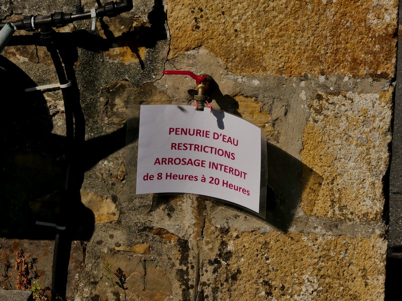 Fin août 2025, l'absence de pluies se fait sentir. Ce n'est pas une sécheresse officielle mais les restrictions d'eau quant aux arrosages se comprennent compte tenu des évaporations immédiates dues à une terre excessivement sèche et chaude. Restrictions en cours au cimetière mais pas sur le balcon de la mairie. Il est 11h15, donc une heure entre 8 heures et 20 heures... Il y a des fleurs plus importantes que d'autres... Les morts n'ayant pas l'intention de se plaindre en mairie, tout va bien.