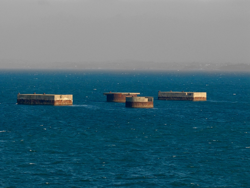Vue générale de l'appontement du terminal pétrolier de l'Otan en Lanvéoc démantelé depuis le quai des annexes. Dans l'eau, en partant de la droite, un duc d'albe allemand, suivi d'un gabion français d'après guerre, suivi d'un second duc d'albe allemand.