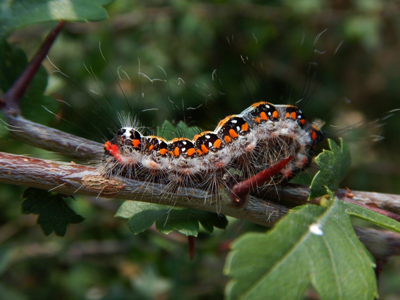 La chenille du papillon de nuit Trident – Poignard noir – Acronicta tridens – est orange, noire et blanche avec des soies longues urticantes. Le papillon lui-même est gris moucheté. Comme quoi, une chenille peut avoir des couleurs très différentes du futur imago. Les plantes hôtes privilégiées sont les saules, les chênes, les aulnes... A noter que l'identification des chenilles oranges et noires peut s'avérer délicate, dans le cas présent les points blancs réguliers sont un bon indice.