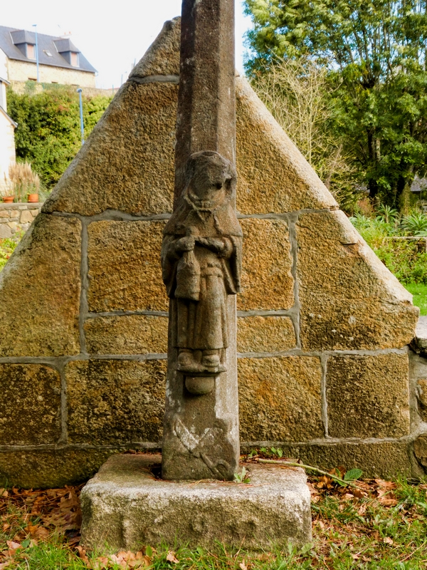 Un fût fuselé (16ème siècle) vestige d'un calvaire représentant Saint Yves au revers de la fontaine Saint Eloi de Roscanvel. Représentation d'une paire de ciseaux symbolisant le tranchant de la justice pour les uns et l'outil symbole de la profession du commanditaire pour les autres. Des artisans fortunés, des bourgeois aiment à financer les calvaires afin de se prémunir d'un au-delà défavorable et d'asseoir une influence sociale terrestre.
