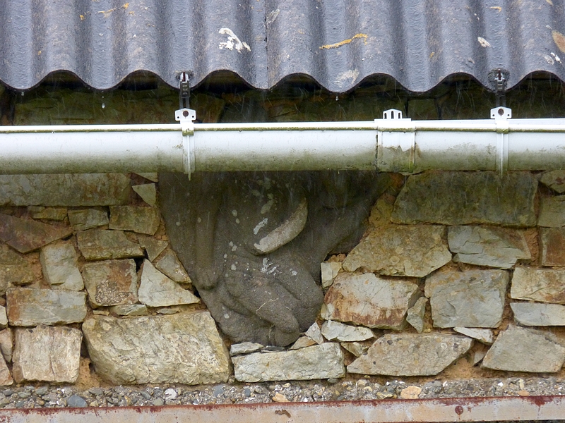 Pierre religieuse en kersanton insérée dans une façade de grange.